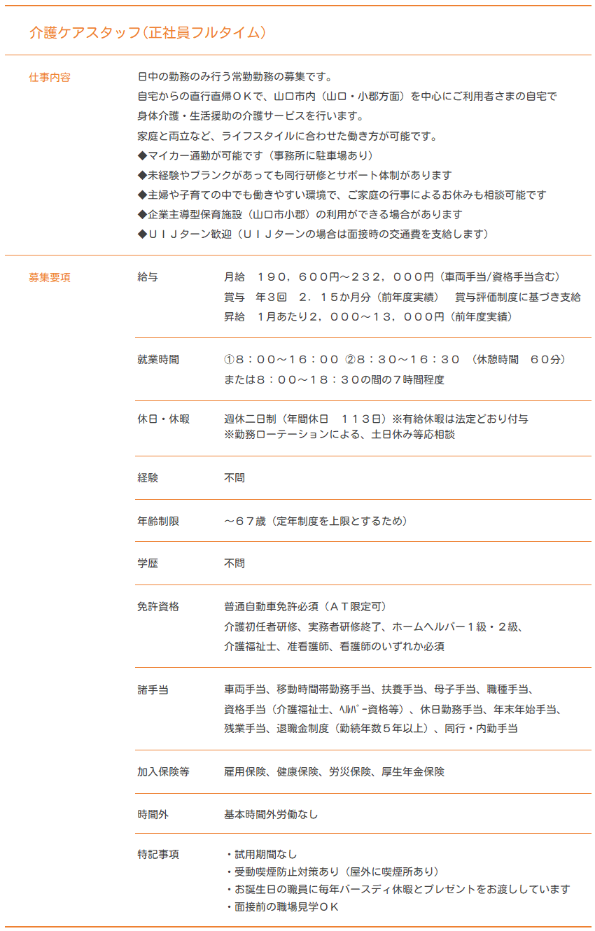 利用者さまと1対1で接するすることが基本的に多いため、最初は不安もありましたが、勤続年数の長いスタッフも多く、同行してもらったり、すぐに相談できて大変心強いです。利用者さまやそのご家族から直接「ありがとう。」と言われることは、少しでも人の役に立てていると実感できてやる気も出ます。